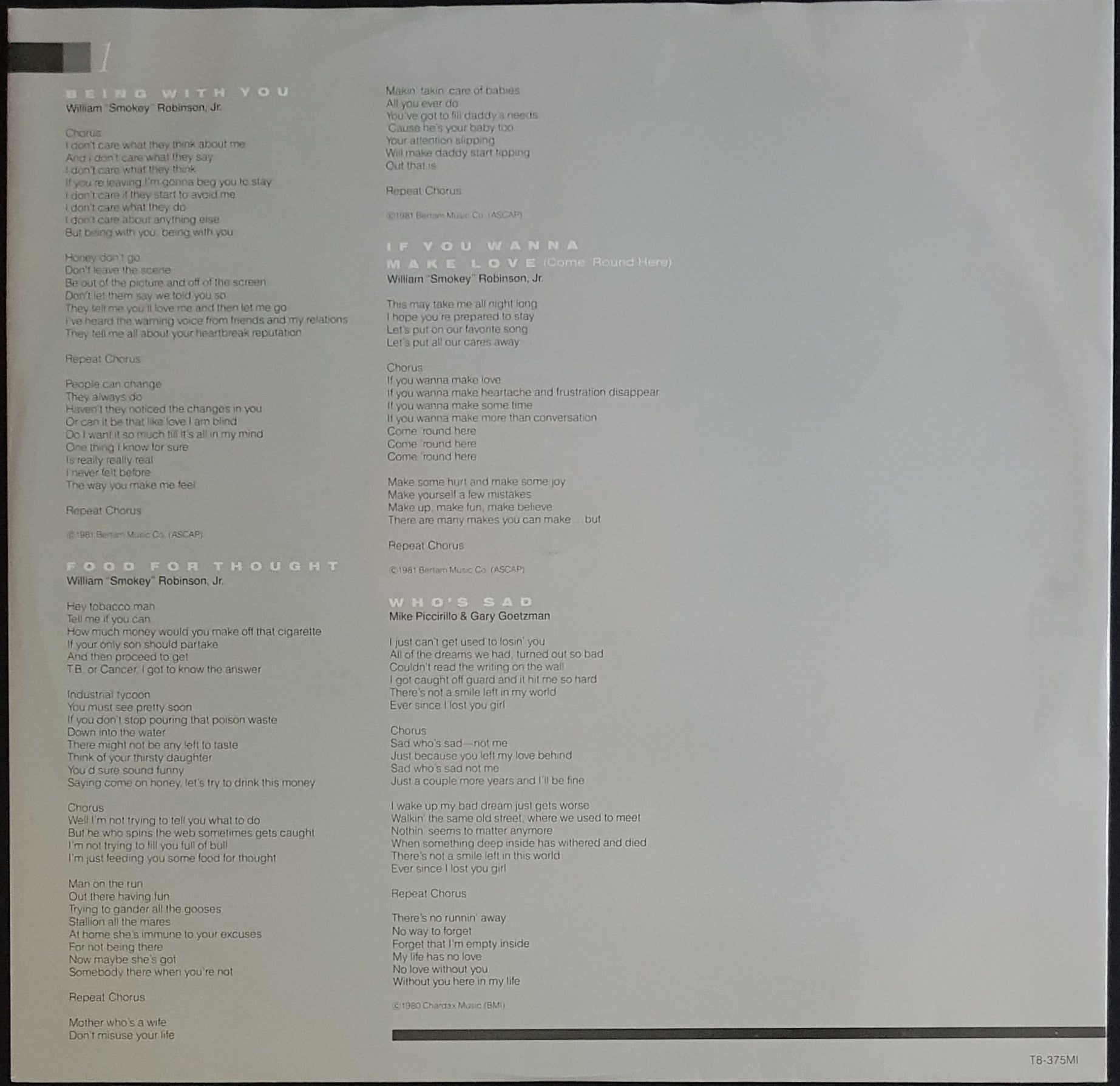 w.Inner Sleeve. 1981 Tamla T8-375M1. Cover has minor surface and corner wear, with small damage spot at opening.