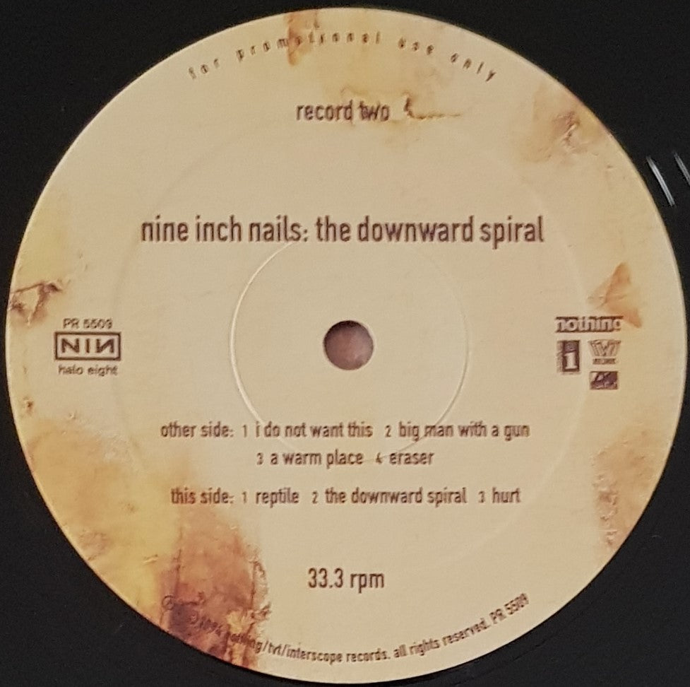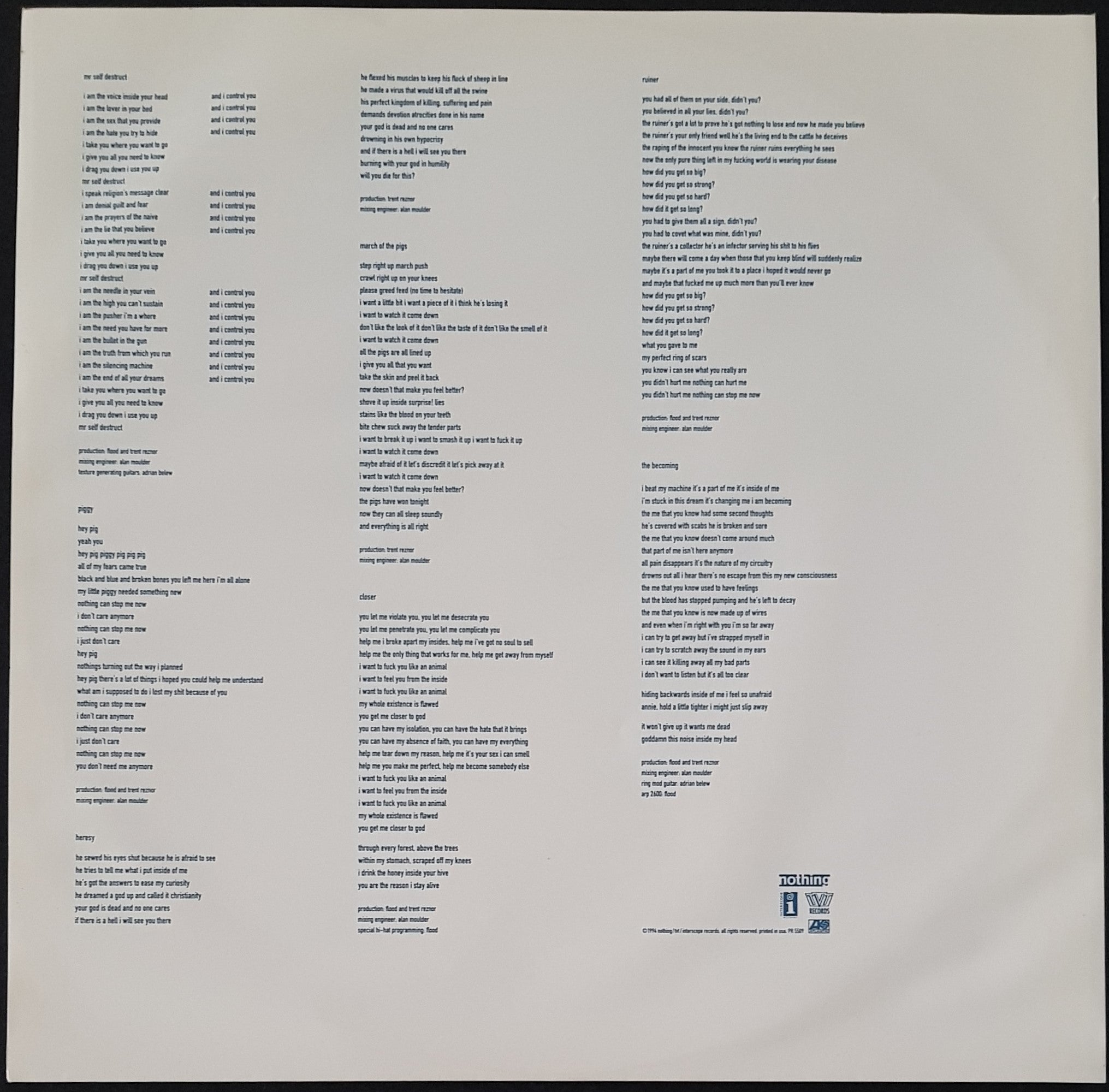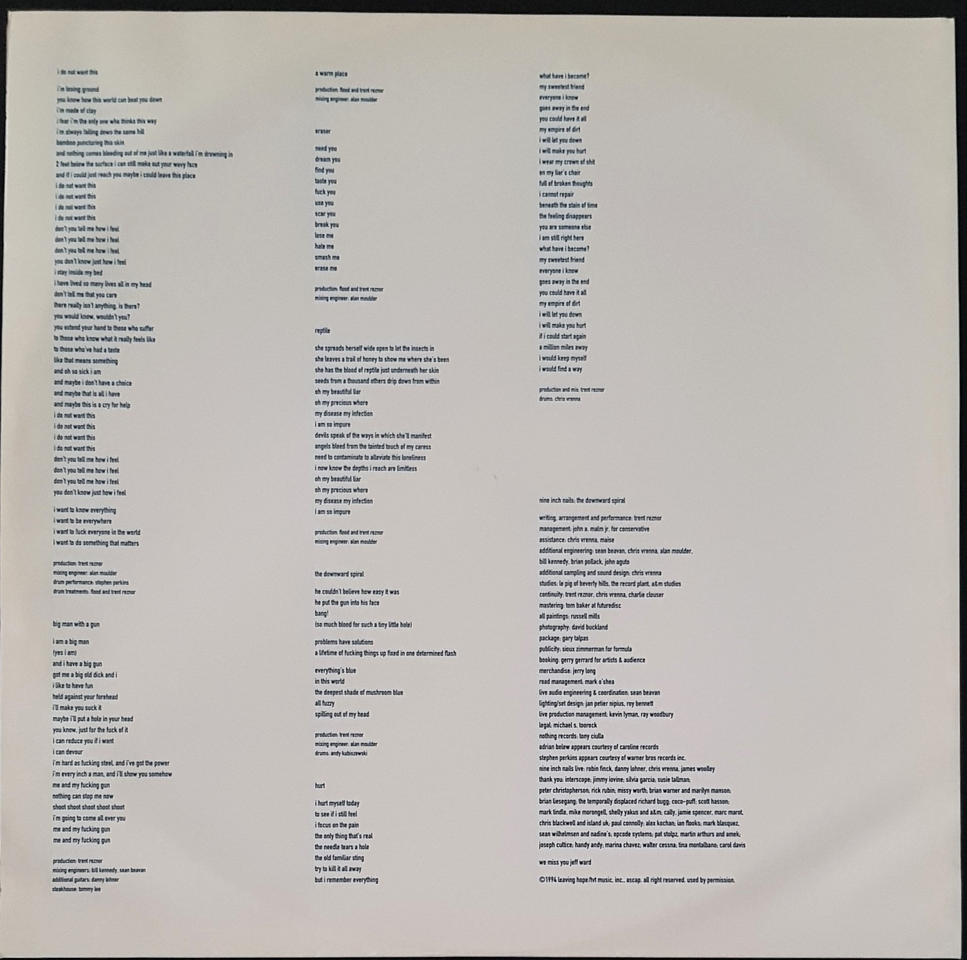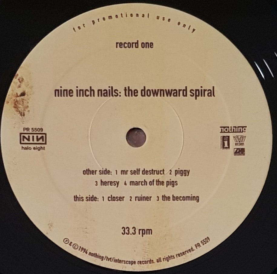 Promo Only Issue. 1994 Nothing Records / TVT / Interscope Records PR 5509. Gatefold Cover w.Inner Sleeves (No Tears or Splits, Minor Handling Marks). Top left hand corner of cover has small crease mark, with minor corner wear. Ring mark / scuff front and back, with minor surface removal along bottom of front cover. Parental Advisory Sticker has crease marks on it. Records are hardly if ever played and have what look more like paper scuff rather than handling marks.