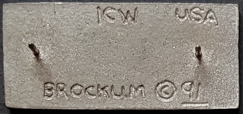 / Promo? Brockum Pressed Metal Pin Back Badge. 2 Clasps are missing. 1.cm x 4.5cm