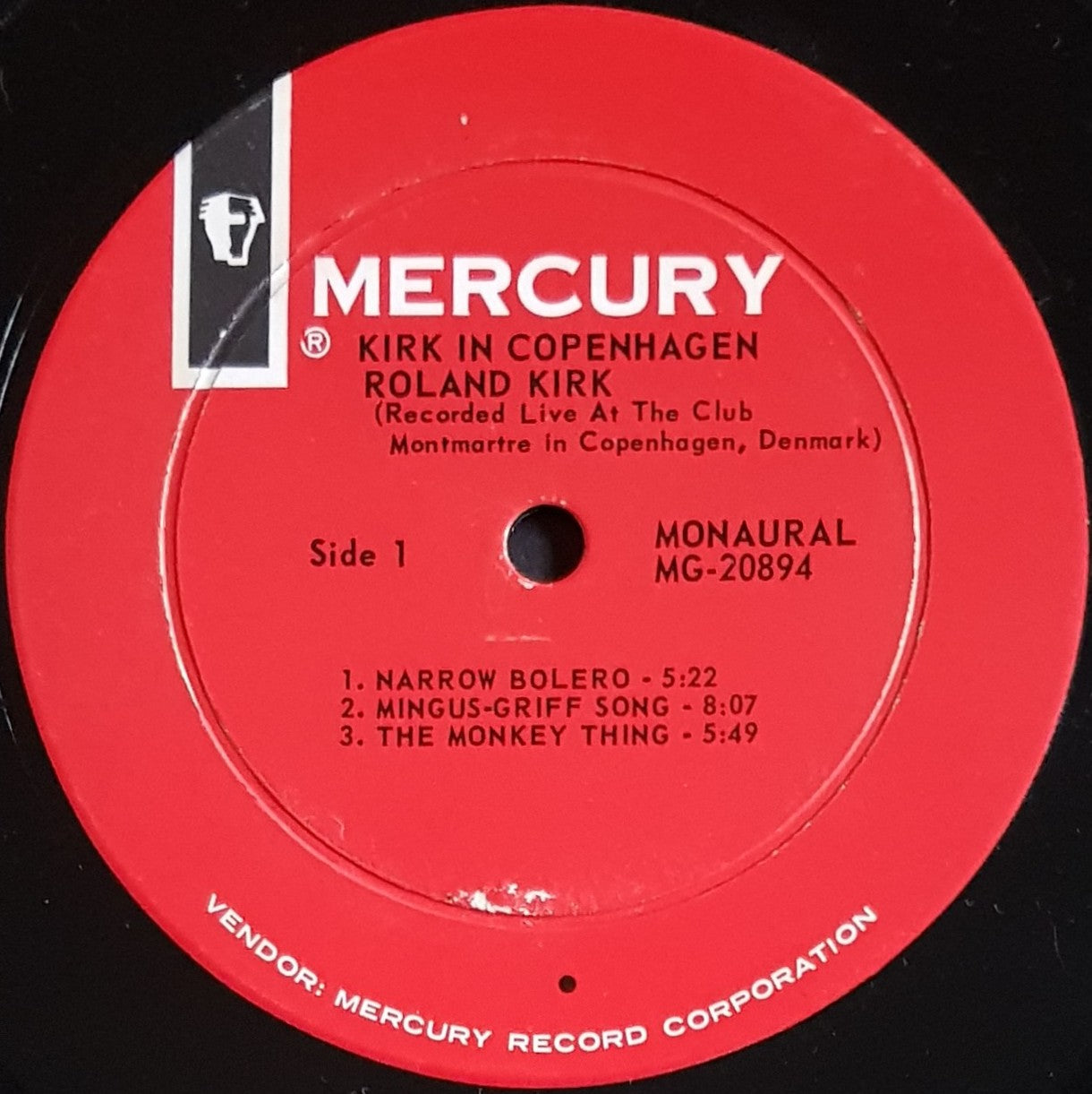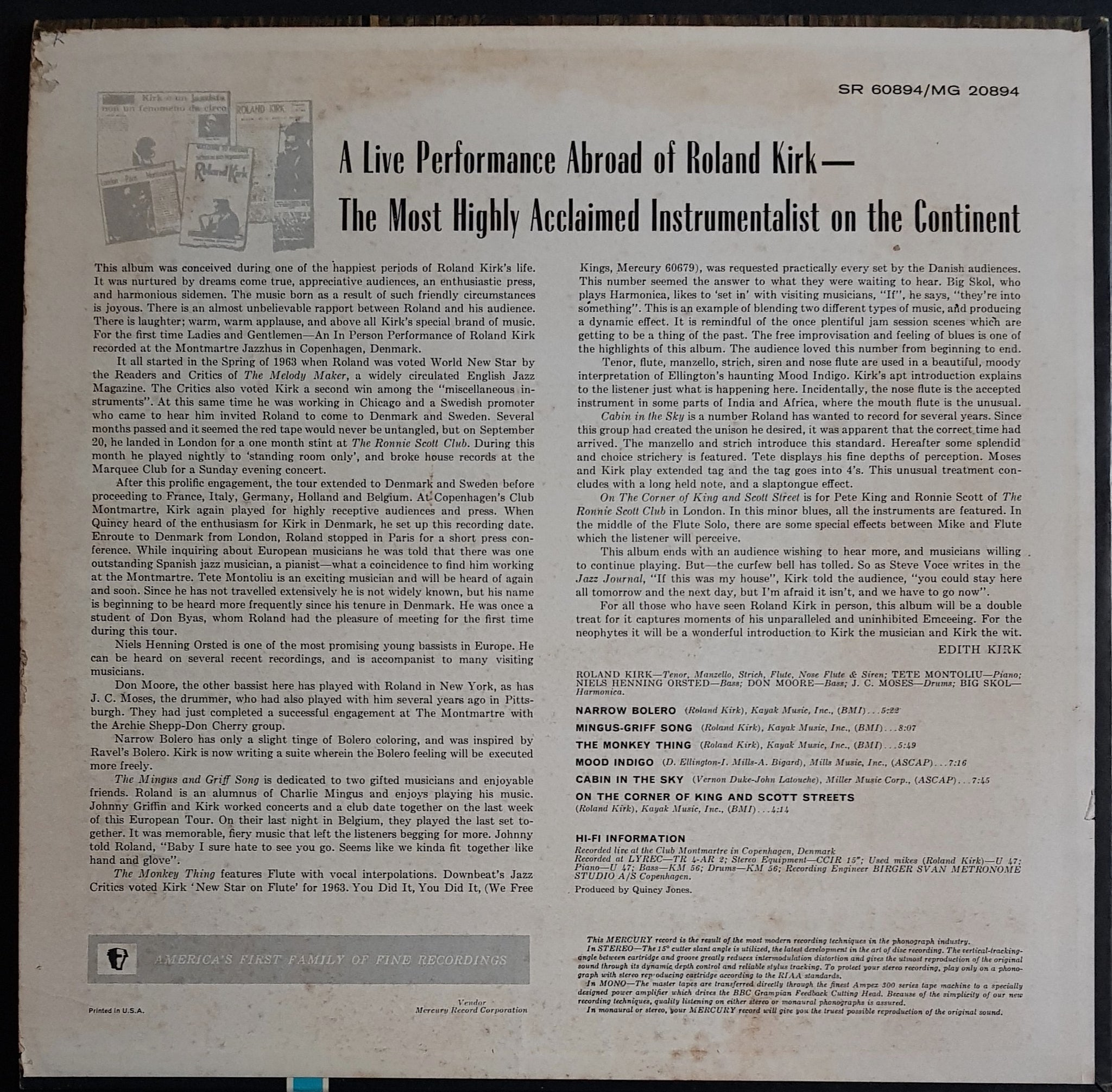 1964 Mono Mercury MG-20894. Foxing on back cover, with small writing (original owners initial "R") and some silverfish damage with paper removal near opening.