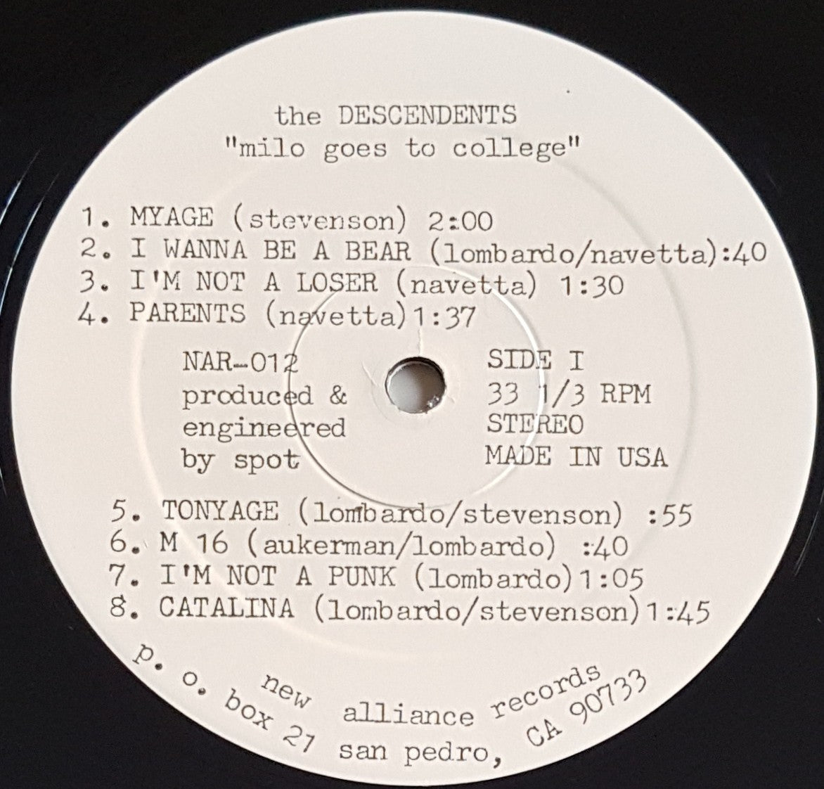 3rd pressing with "Marketed by SST Records" printed at bottom-right of back cover. 1984 New Alliance Records NAR-012. Corner creases, edge and corner wear, minor ring wear and foxing on cover. Small bump and minor damage spot on spine. Record is very clean.