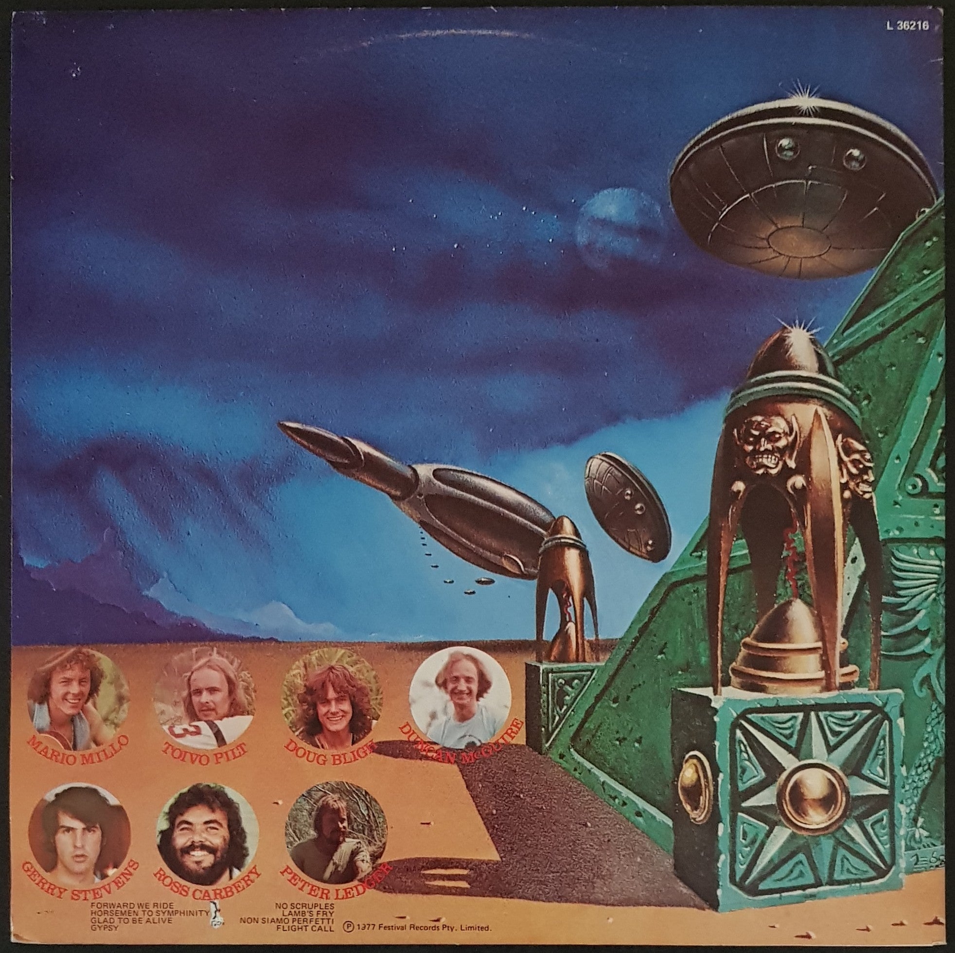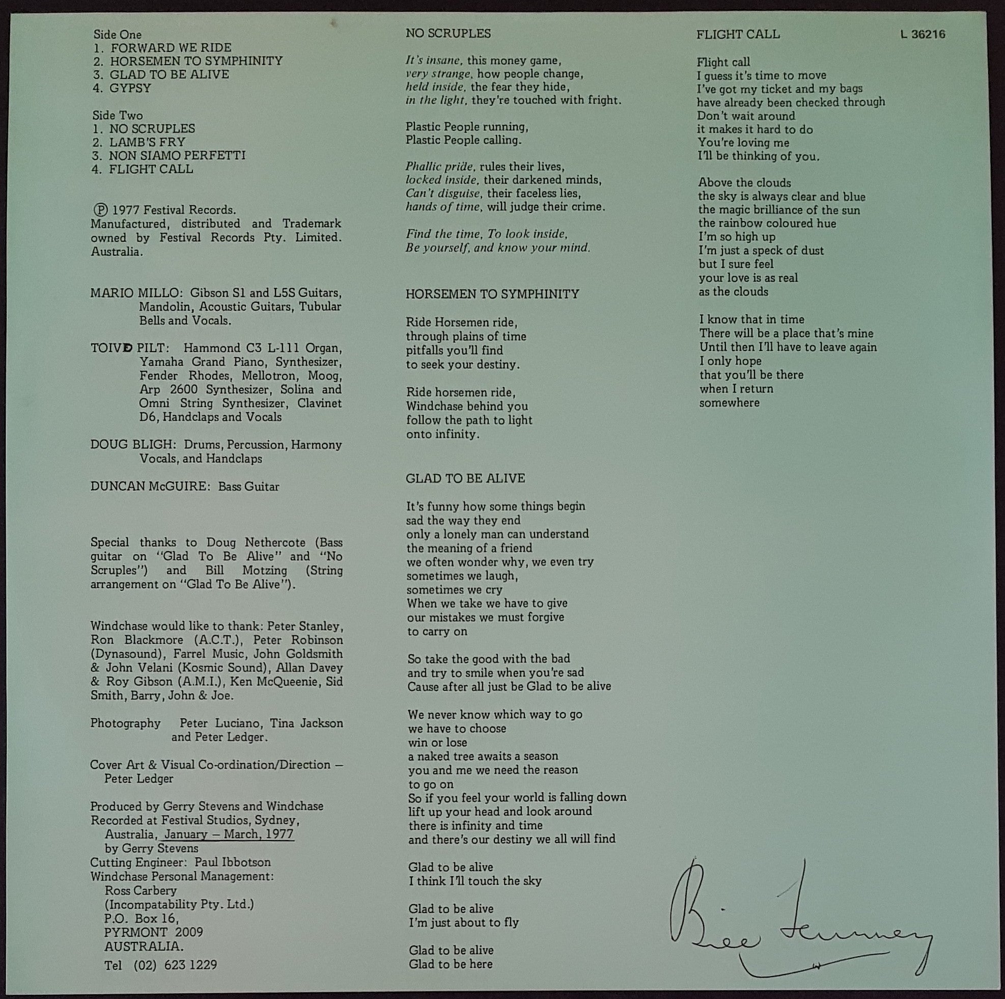 Gatefold Cover w.Insert (has writing). 1977 Iinfinity L-36216. Mario Millo Guitar. .Minor Wear on Cover. Sold with 3p. promo sheets and an original promo T-shirt from Festival in original plastic bag!
