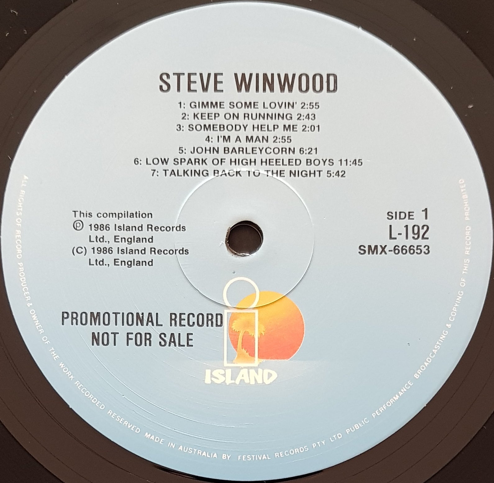 Promo Only Compilation. 1986 Festival / Island Label L-192. Comes in plain white sleeve with Info sticker on it