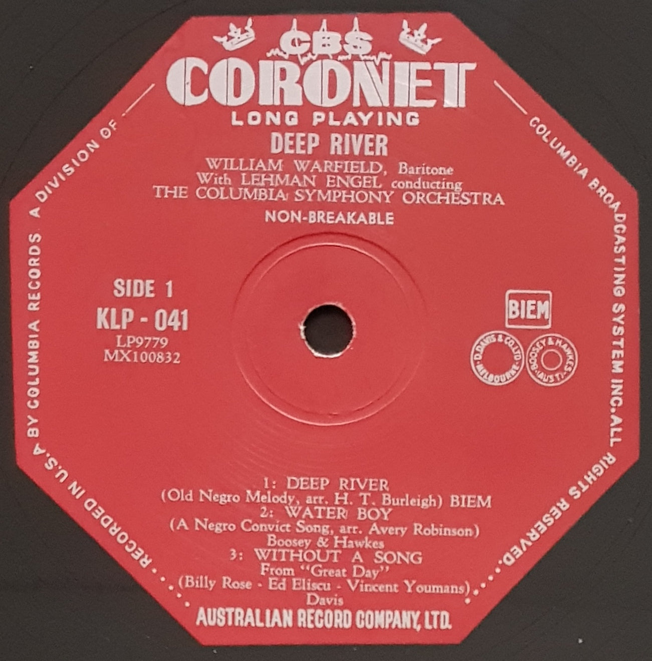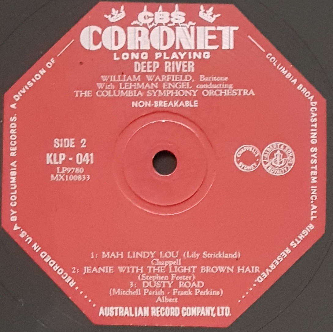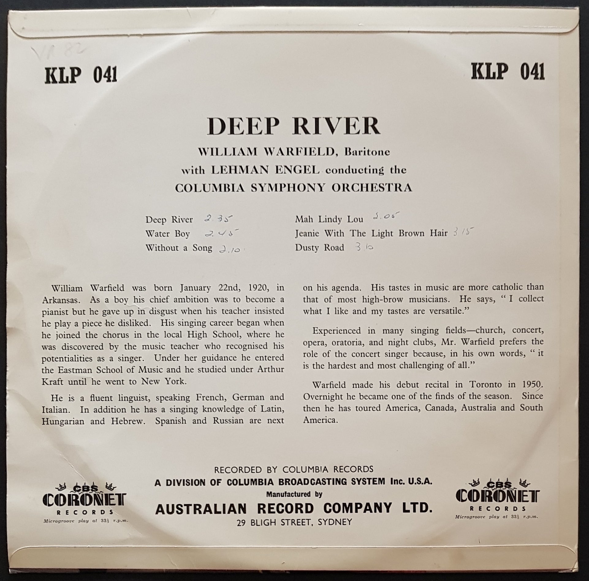 LP. 1952 CBS / Coronet KLP 041. Cover is super clean and laminated front is glossy. Track times written on back cover. Disc has light hairline and surface marks.