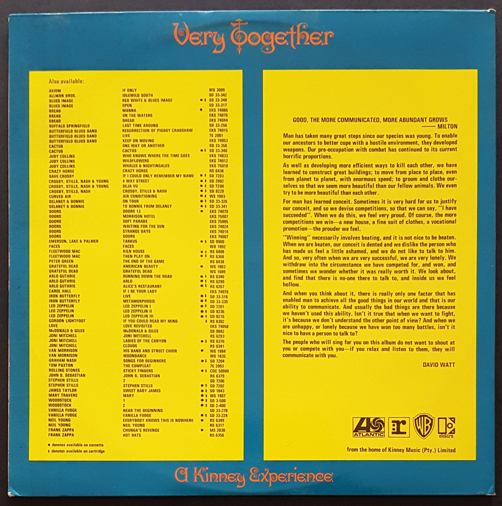 1971 WEA Compilation where Each Side Is Dedicated To Specific Labels, Atlantic, Elektra, Warner Bros. & Reprise KINNEY1. Features 1 Neil Young & 1 Crazy Horse Track along with Yes, Love, E.L.P., Dr.John, Iron Butterfly, Mike Herron, Alice Cooper, Autumn, Joni Mitchell, Van Morrison, Grateful Dead and Others.