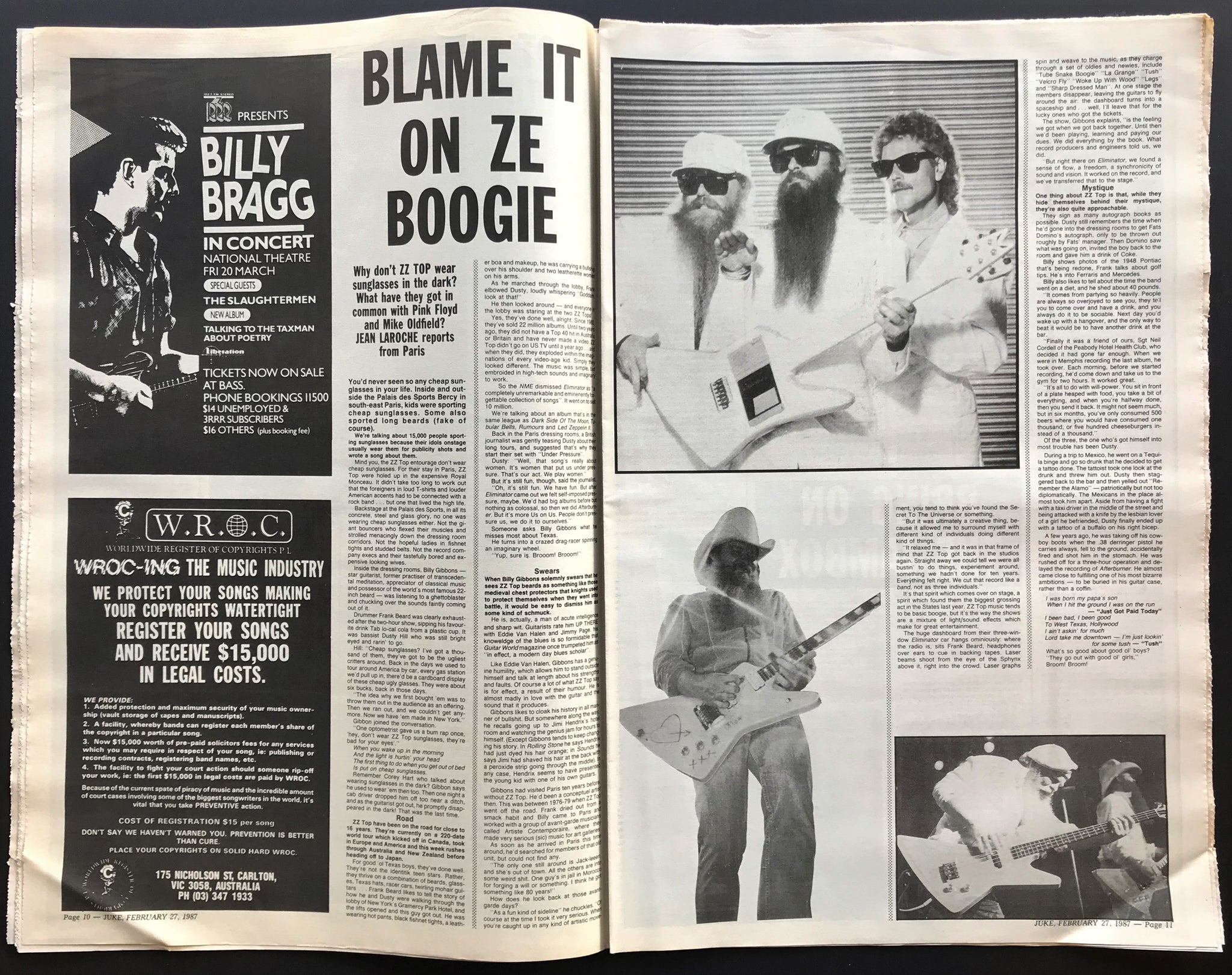 w. ZZ Top Cover & Article. Issue Also Features, Reviews And Or Has Ads for Midnight Oil, The Hangmen, Billy Bragg, Erasure, Crowded House, Hunters & Collectors + Others.