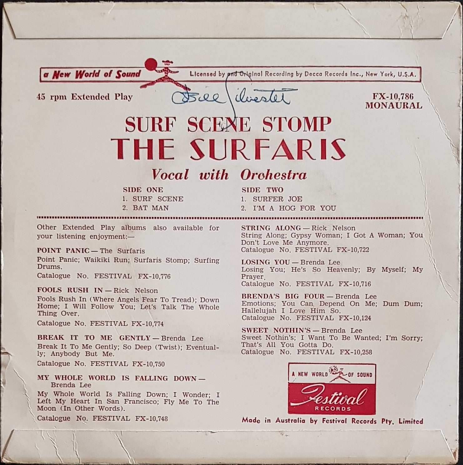 EP PS. 1963 Festival Records FX-10,786. Minor wear, scuffs, creases, foxing and small writing on back cover. Writing on labels. Light hairlines and scuffs on disc