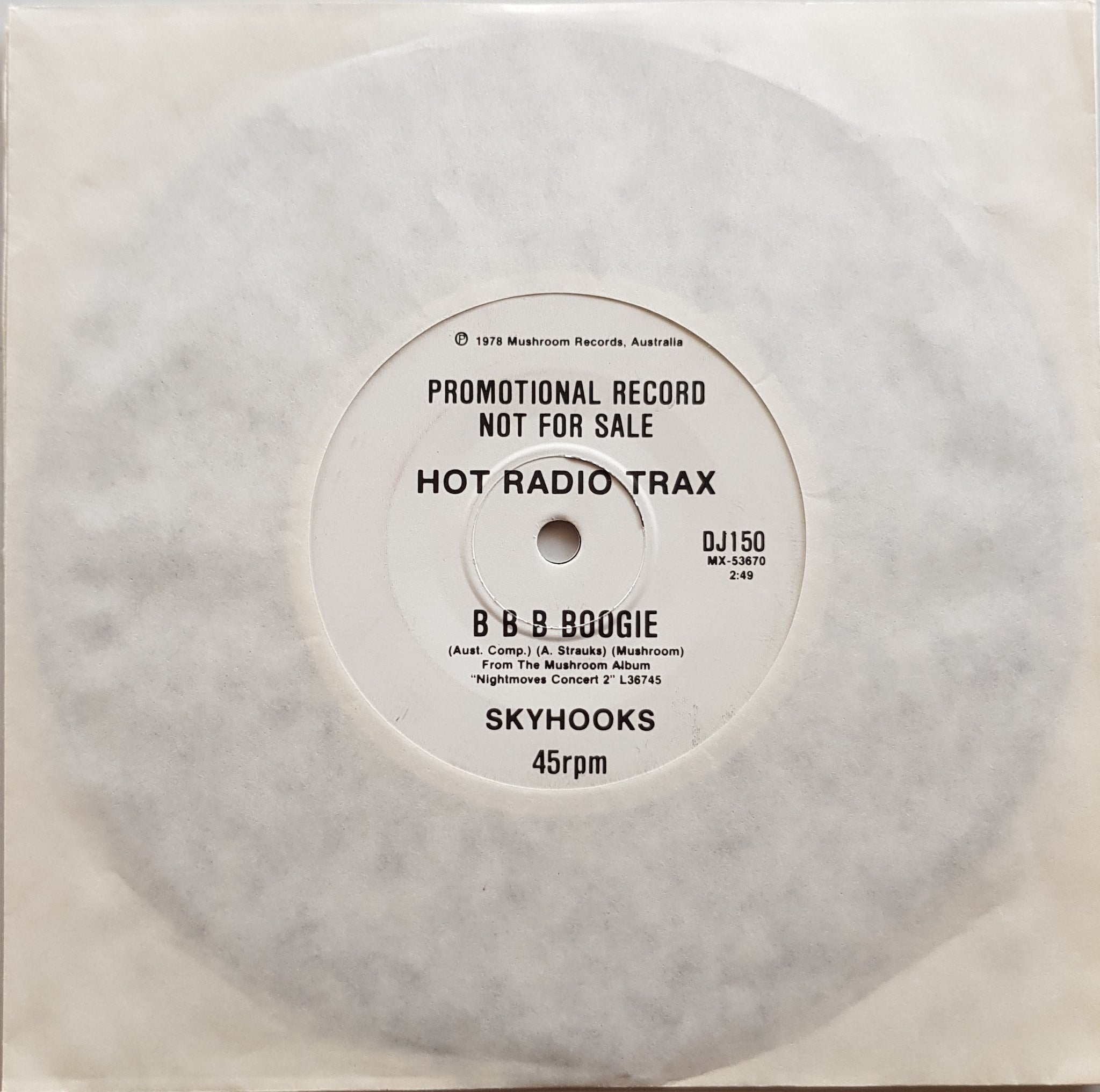 White Label Promo Only Issue w. Sports - Wedding Ring on The Flip Side. 1978 MUSHROOM DJ150. Tracks taken from the album "Nightmoves Concert 2"