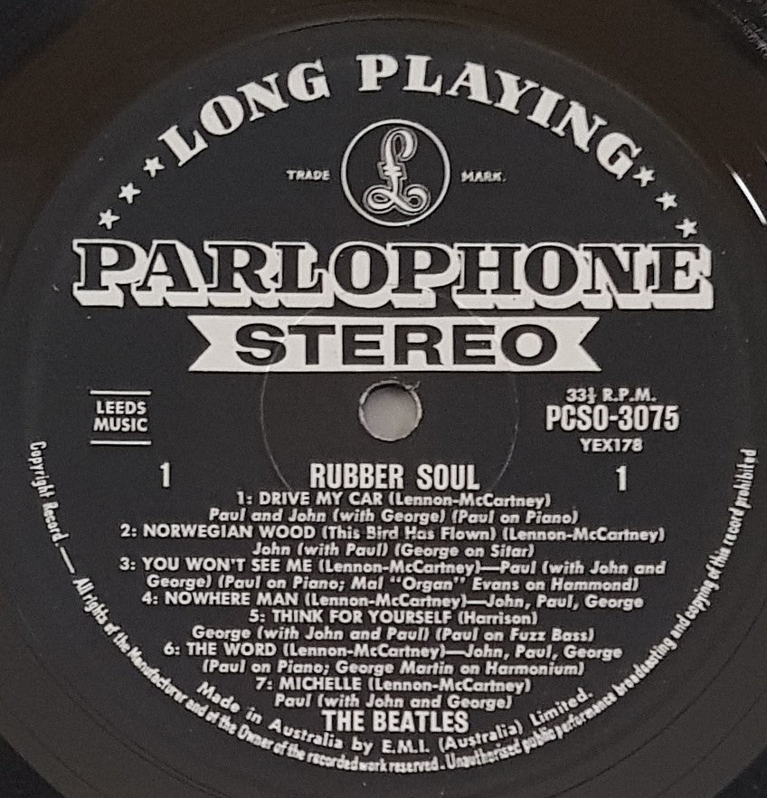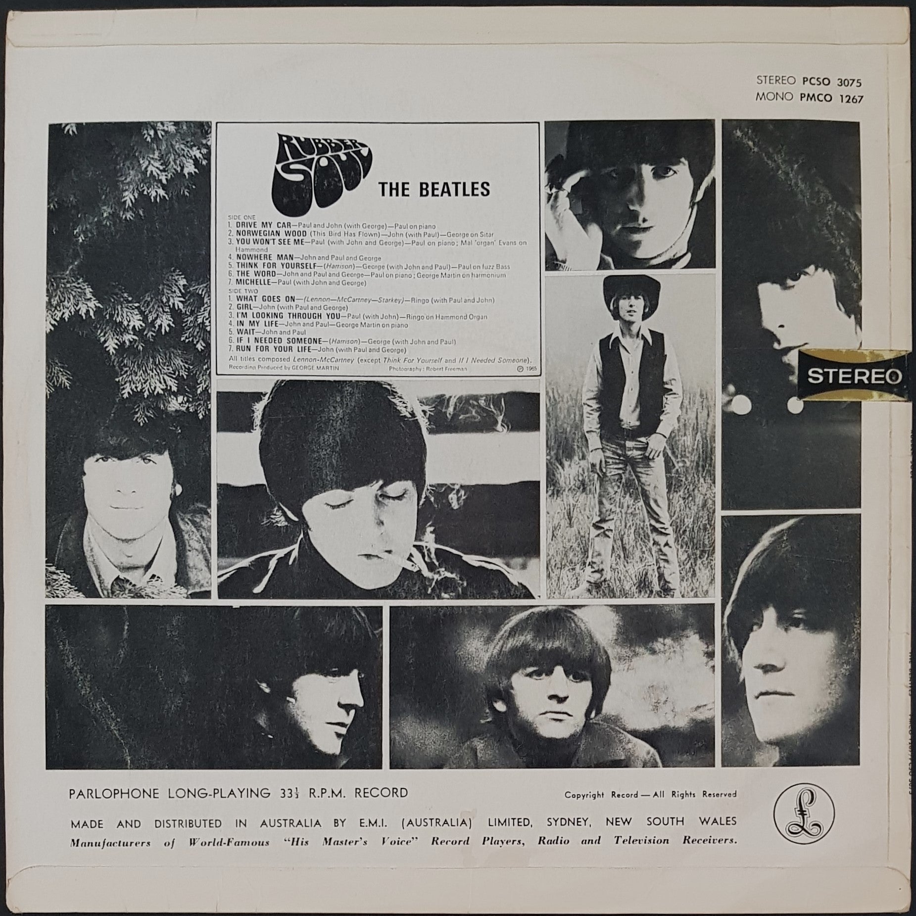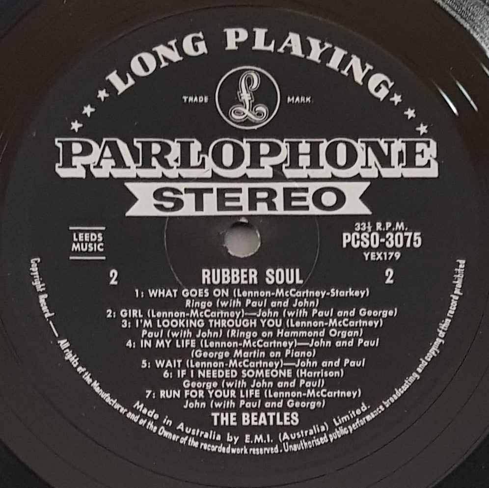 1966 Original Black/Silver Parlophone Banner Label PCSO-3075. LEEDS MUSIC Publishing Only. Laminated front cover has minor wear. Corner crease & 2 worn edges. Small mark on "What Goes On" will sound. Several light scuffs and surface marks, plays with some surface noise.