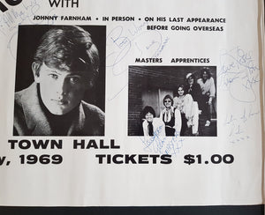 For February 14th, 1969 Johnny Farnham Farewell Performance at Dandenong Town Hall. Supported by Zoot & Johnny Farnham. Signed by Johnny Farnham, Zoot members Darryl Cotton, Roger Hicks, Rick Brewer & Beeb Birtles, and by Masters' members Doug Ford, JimKeays, Colin Burgess & Glenn Wheatley. Poster measures 45cm x 58cm.