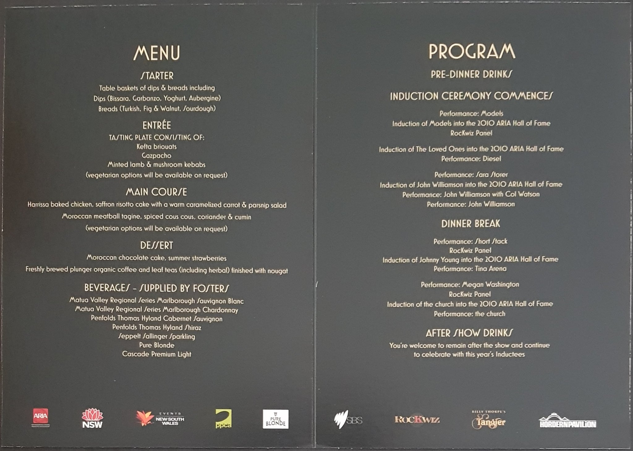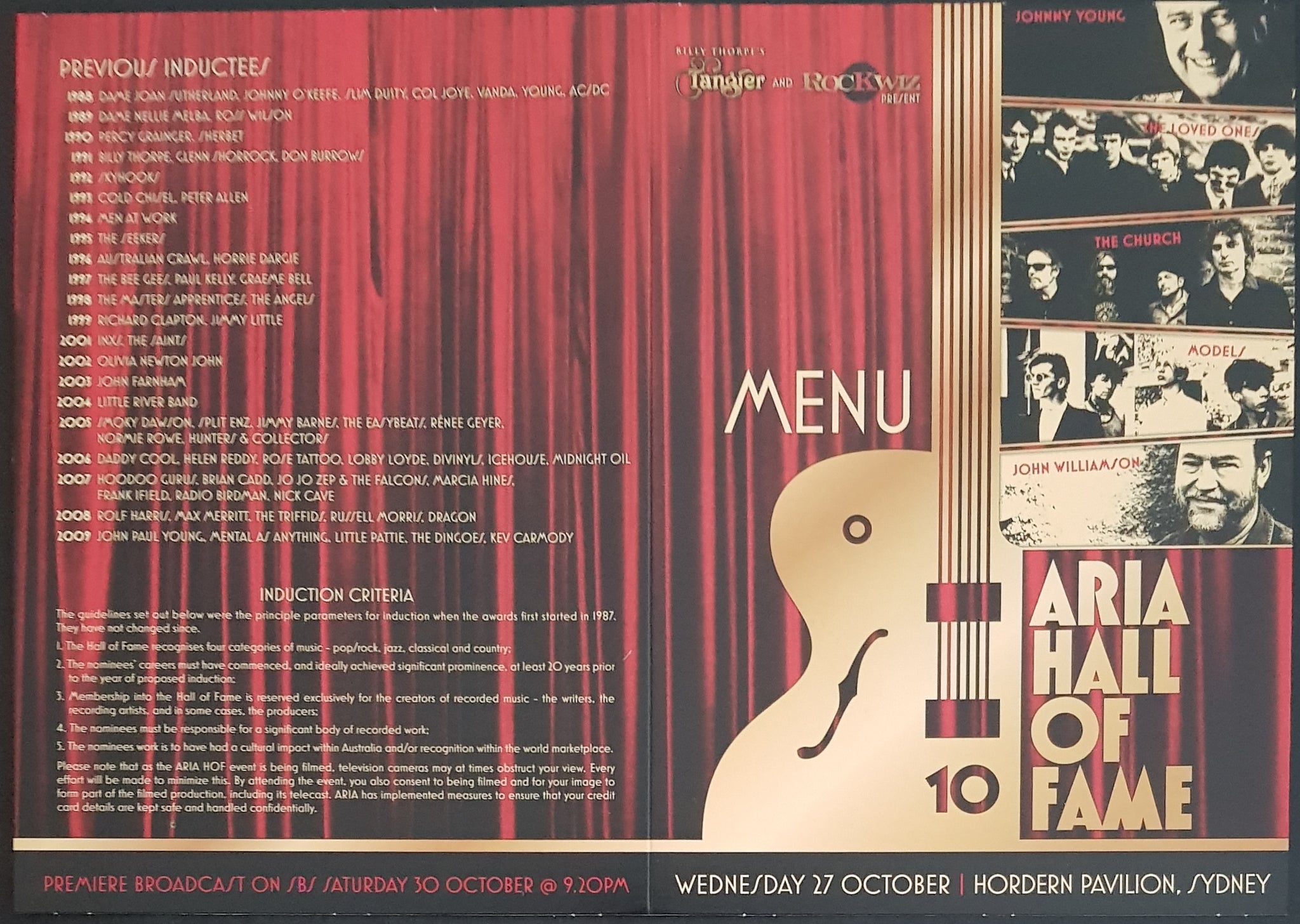 Table Menu / Performance Card for Induction Ceremony. Also Inducted that evening were the Models, The Loved Ones, John Williamson & John Young. Performers included Diesel & Tina Arena