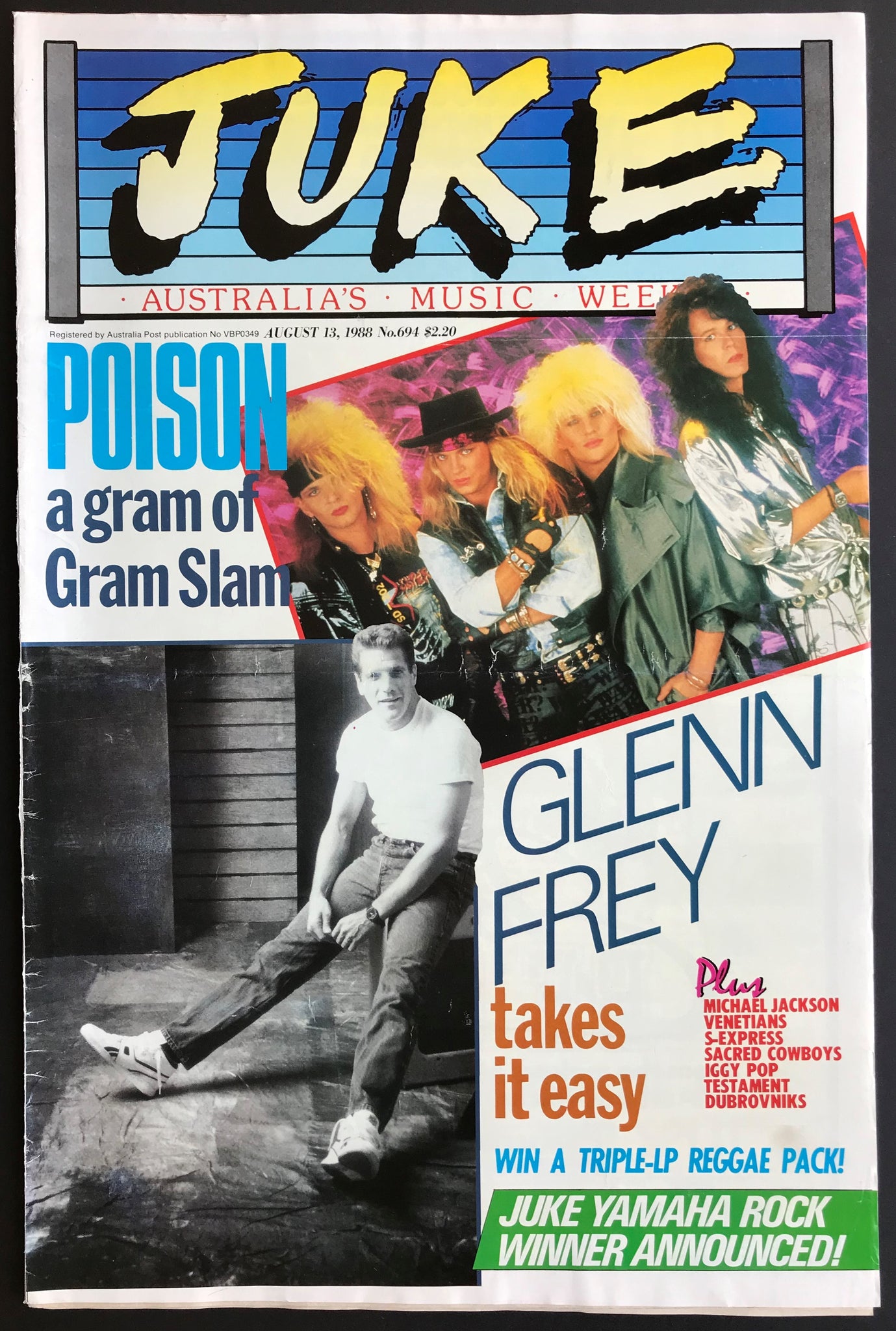 w. Poison & Glenn Frey Cover & Articles. Issue Also Features, Reviews And Or Has Ads for The Venetians, Iggy Pop, Sacred Cowboys, The Johnnys, Triffids & others. Previously folded in half