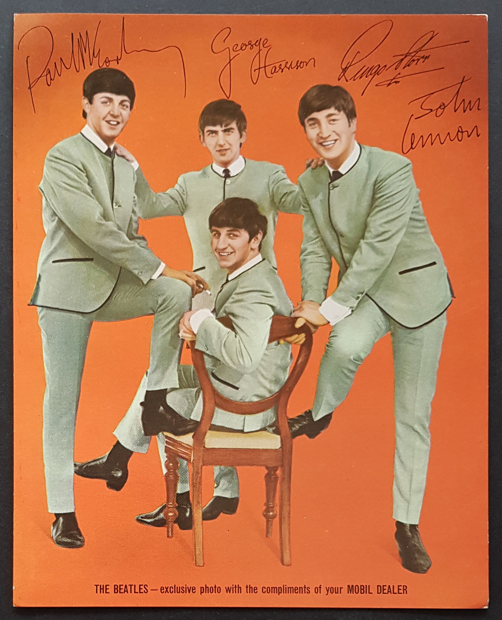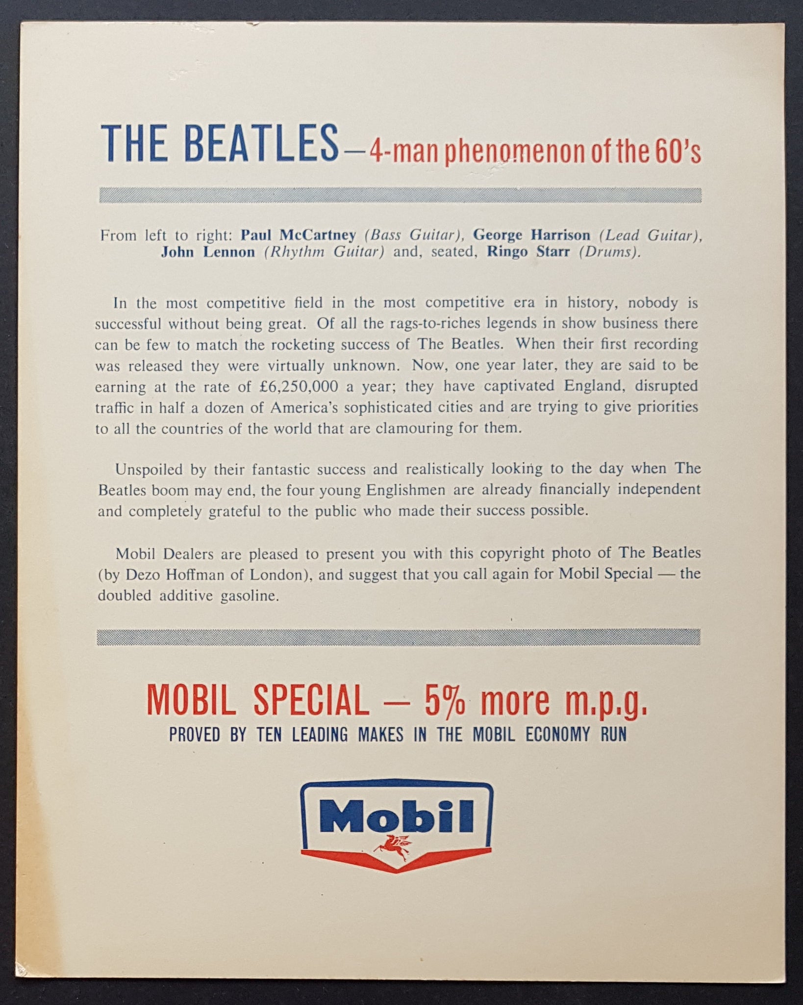 8" x 10" Colour Card. Front has Picture Of Beatles w. Xeroxed Autographs. Write-up On Back. Was Available Only From MOBIL Gas Stations In 60's. Light Scuffing On Front, Minor Stain On Back.