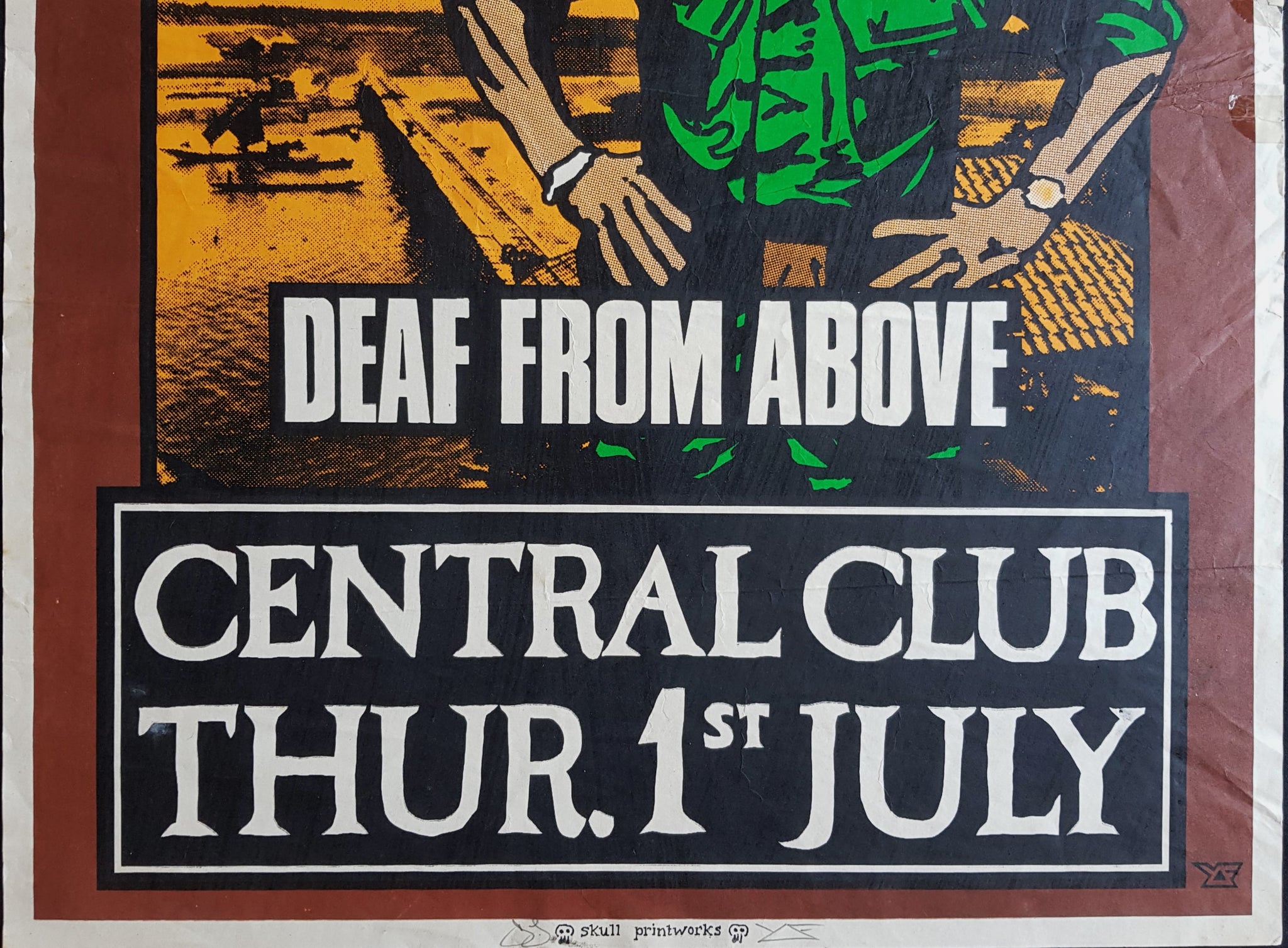 Original John Foy Screen Print For Show at The Central Club, Thursday July 1st, 1982. Creased with Tape Repaired Tears on Front. Signed by the artist. 51cm x 76cm